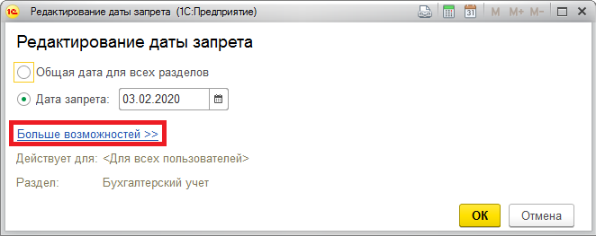 Дата запрета редактирования в 1С: Бухгалтерия 8 (такси)