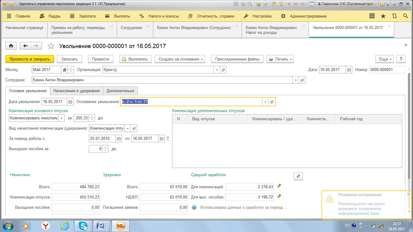 Компенсация отпуска при увольнении в 1С 8.3 Бухгалтерия