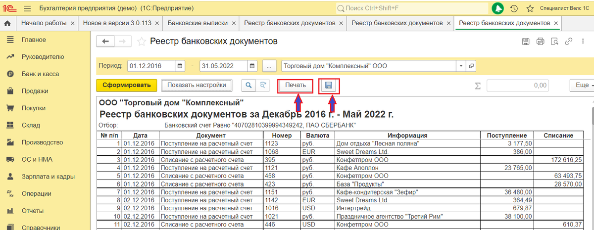 Печать реестра документов разного типа в программе 1С:Бухгалтерия 3.0