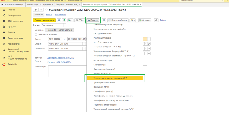 Товарно-транспортная накладная (ТТН) в 1С 8.3 Бухгалтерия