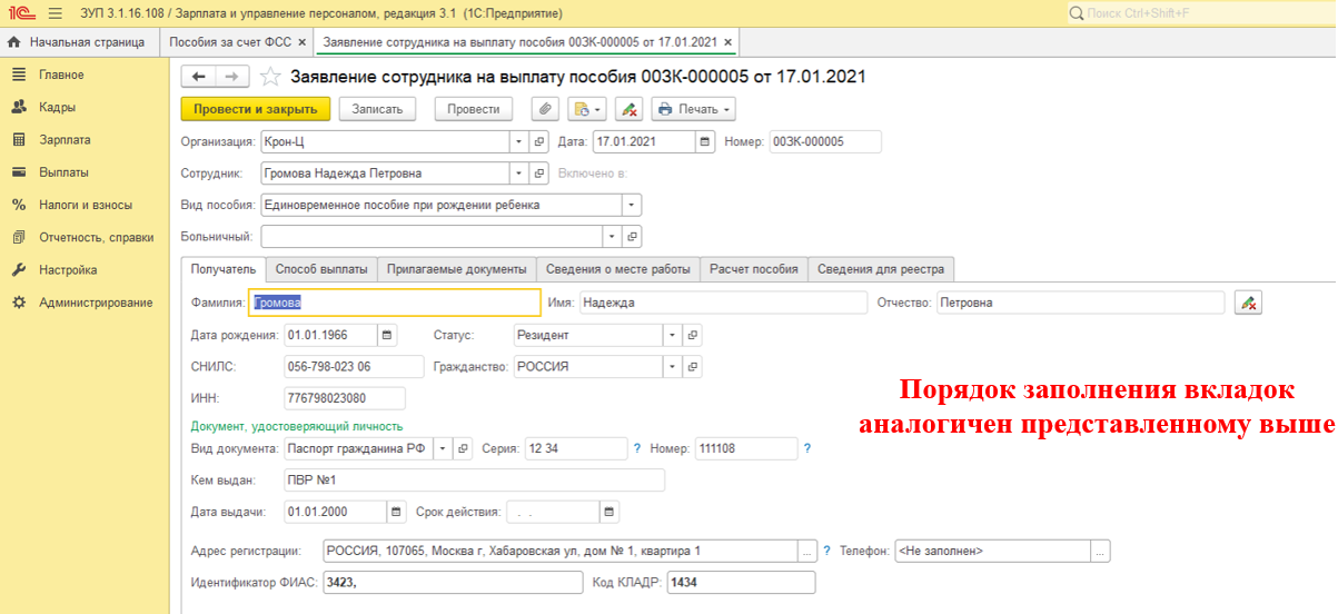 1С. Создание и отправка в ФСС пособия при рождении ребенка