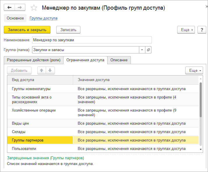 В случае изменения требований к доступу к номенклатуре, обновите настройки группы доступа