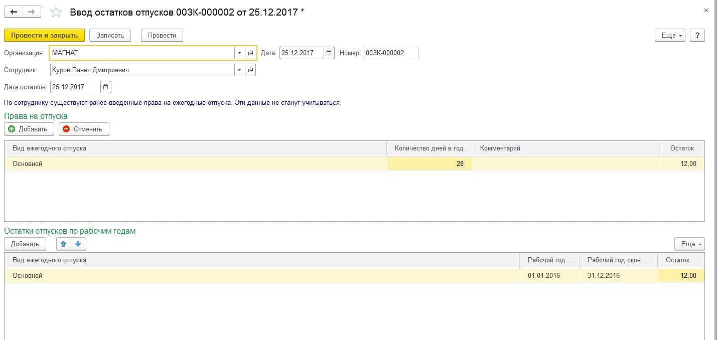 Ввод остатков отпусков в 1С:ЗУП 3.1
