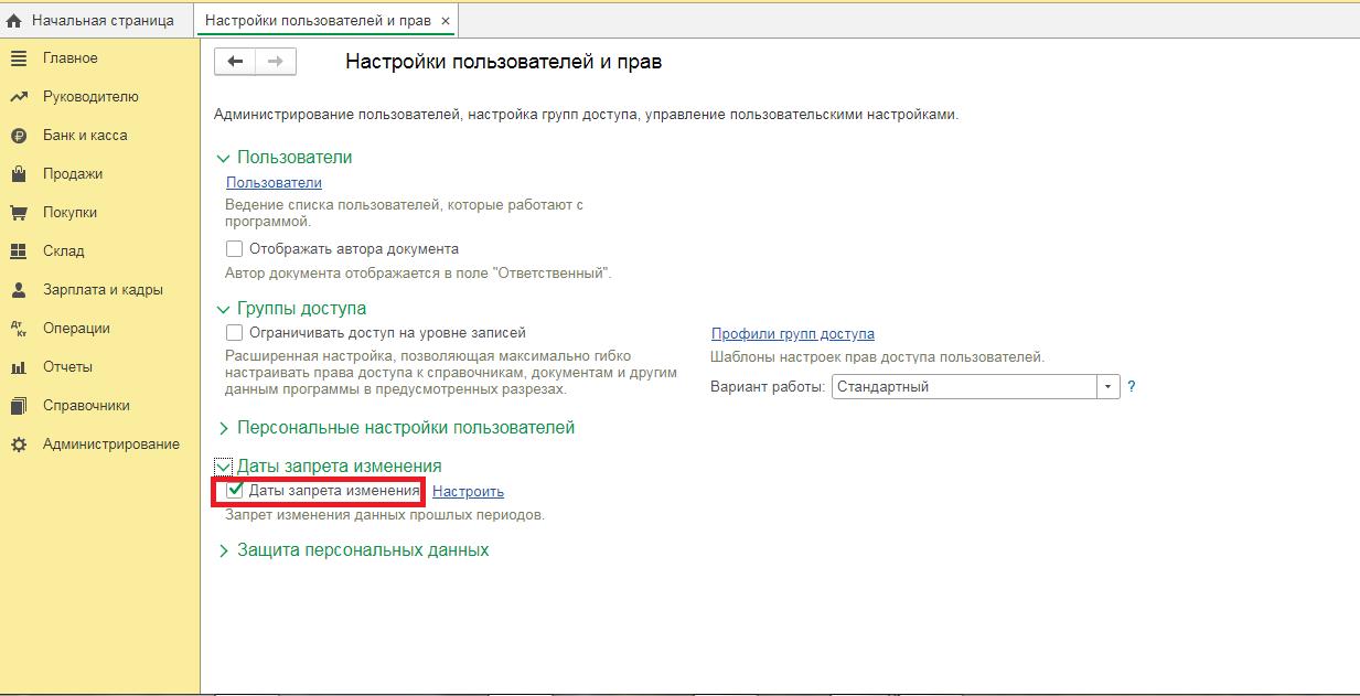 Запретить пользователям изменять документы - Дата запрета редактирования - Настройка 1С