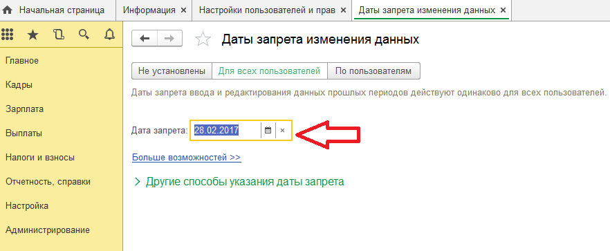 Установим дату запрета редактирования данных 1С ЗУП 8.3