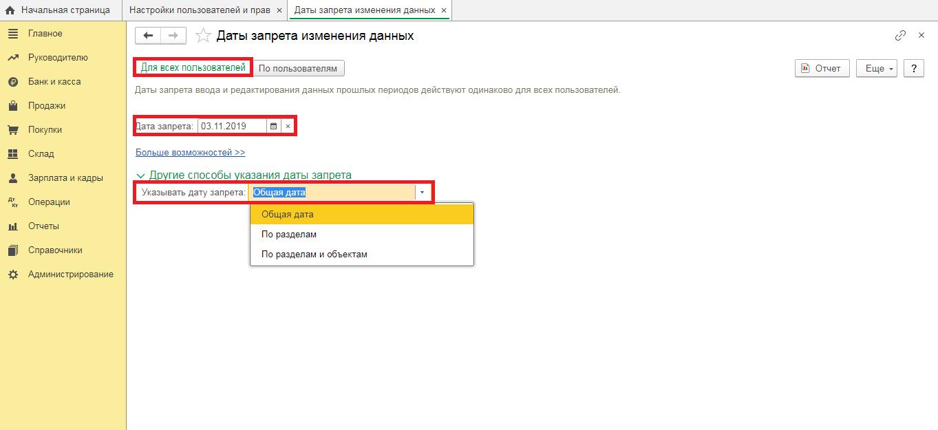 Запретить пользователям изменять документы - Дата запрета редактирования - Настройка 1С