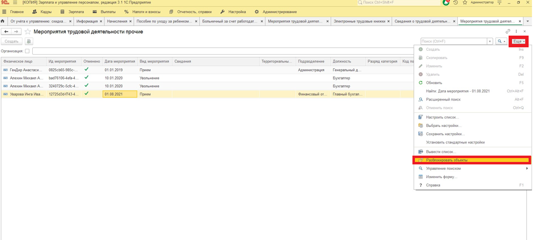 Не забывайте про систему контроля версий или журнал операций программы 1С ЗУП. Это позволит вам отслеживать изменения и восстановить удаленные мероприятия трудовой деятельности, если вдруг потребуется.