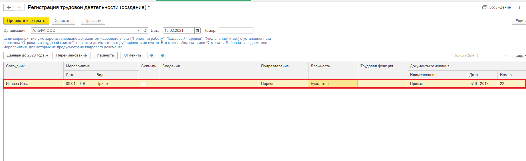 Проверьте правильность заполненных данных перед отправкой регистрации трудовой деятельности в программе 1С ЗУП.