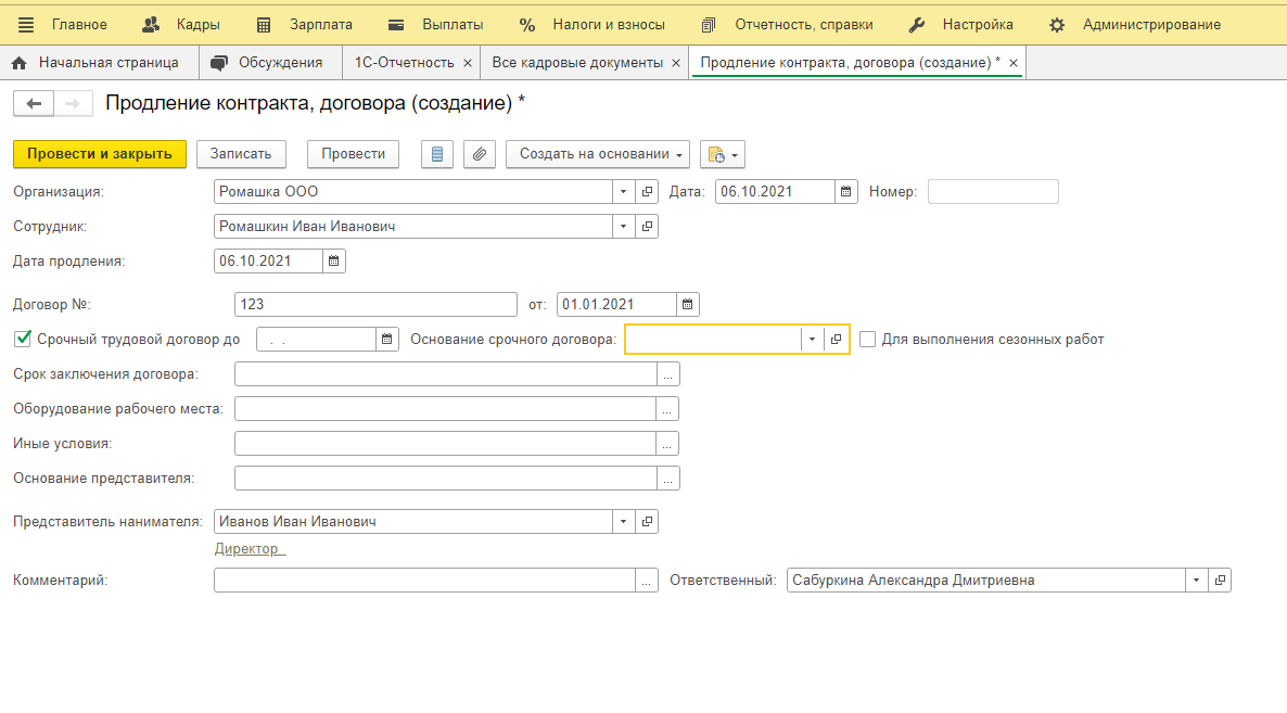 В случае возникновения ситуации, когда работнику необходимо продлить срочный трудовой договор на 1С ЗУП, своевременно обращайтесь в отдел кадров для подготовки соответствующих документов.