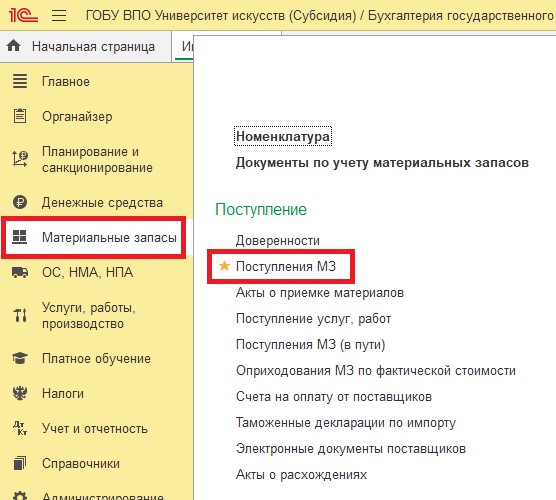 Покупка и списание материальных запасов (МЗ) в 1С:БГУ ред 2