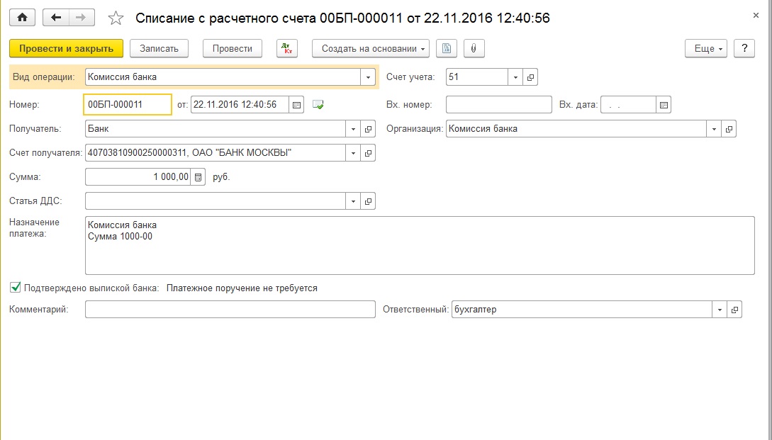 Как отразить в 1С 8.3 услуги (комиссию) банка