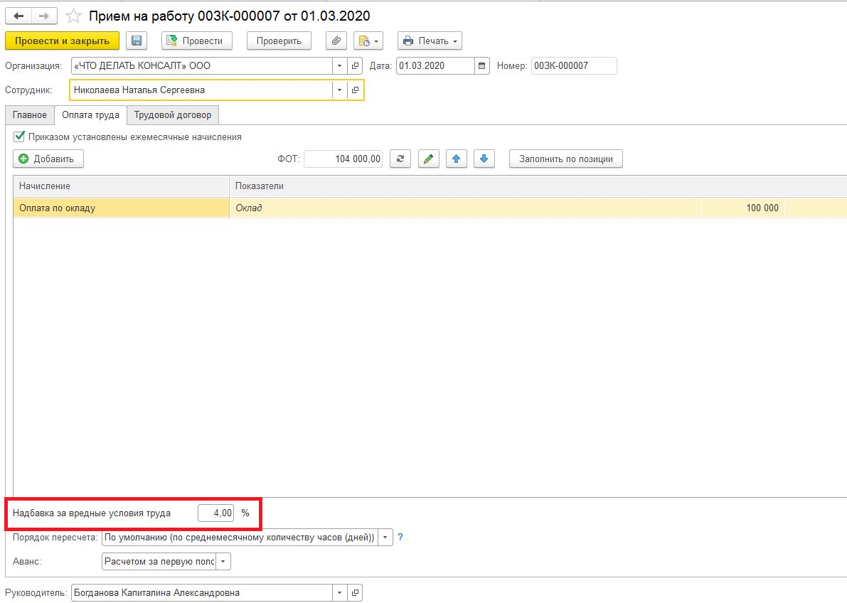 Надбавка за вредность в 1С:ЗУП