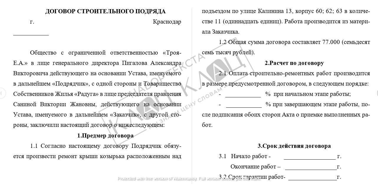 Обязательно укажите условия расторжения договора подряда, а также порядок продления срока действия.