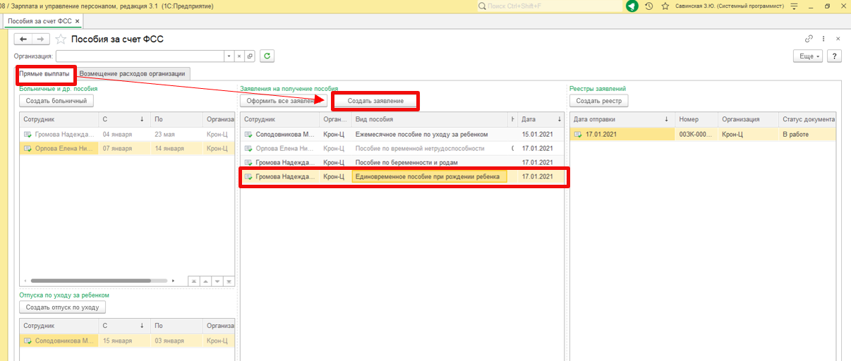 ЗУП 8.3 Реестр прямых выплат для единовременного пособия при рождении ребенка