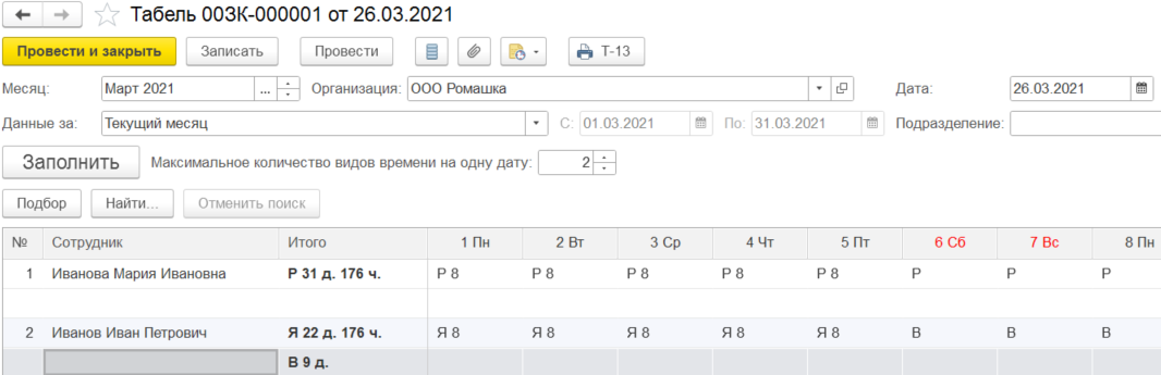 Заполнение табеля учета рабочего времени сотрудников 1С