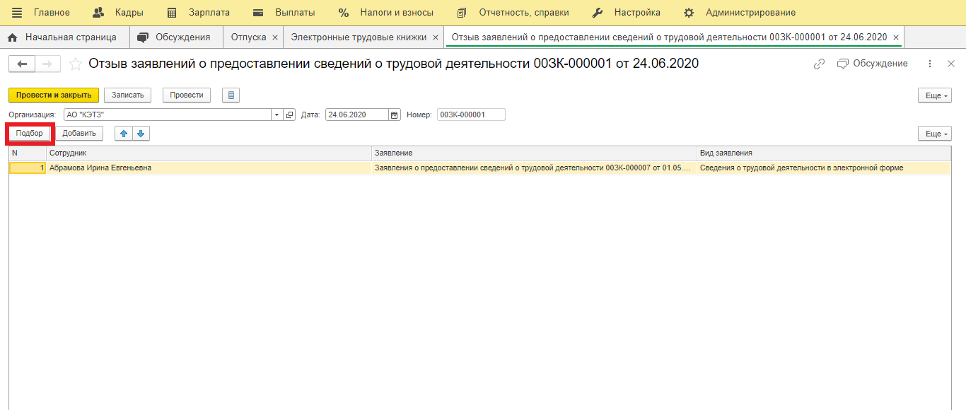 Регистрация заявления о выборе бумажной или электронной трудовой книжки в 1С:ЗУП ред. 3
