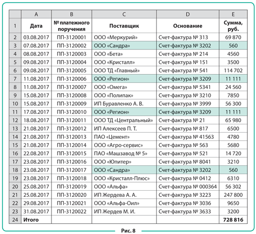Для поиска задвоений в больших объемах данных используйте фильтр в Excel и установите критерий поиска равным больше 1.