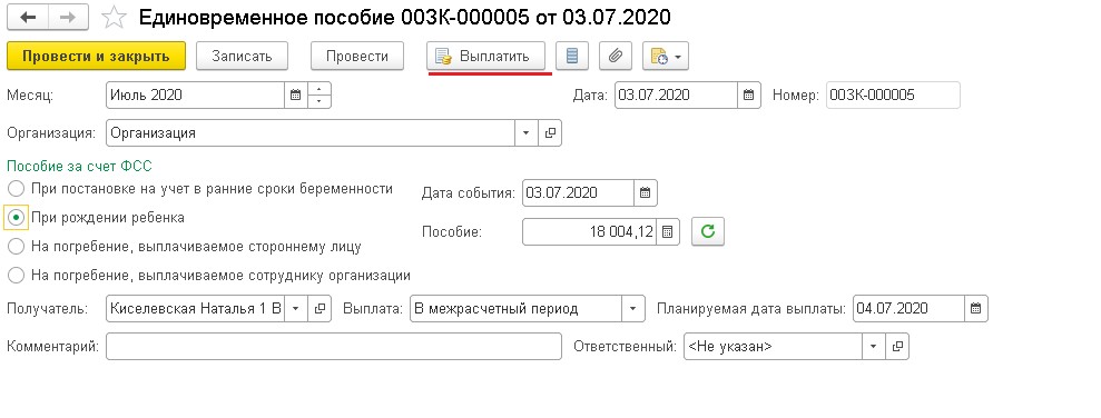 1С. Создание и отправка в ФСС пособия при рождении ребенка