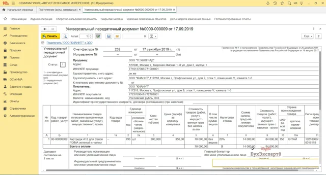 Регистрация УПД от поставщика в 1С Бухгалтерия
