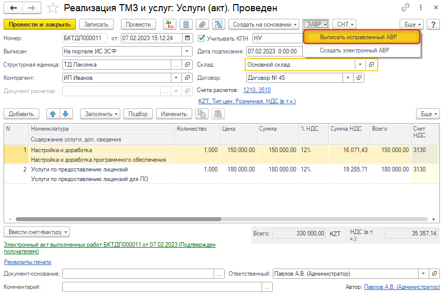 Выписка ЭАВР (электронного акта выполненных работ) в 1С Бухгалтерии для Казахстана 3.0