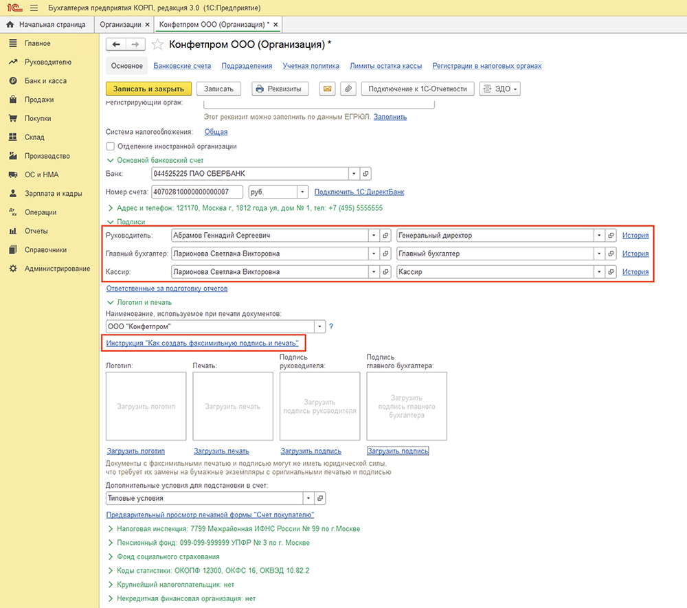 Учтите, что загрузка печати и подписи руководителя может потребовать времени, особенно при большом количестве документов в программе 1С.
