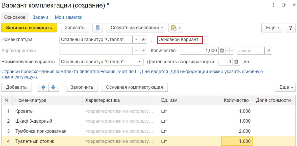 Комплектация номенклатуры в 1С 8.3 пример заполнения