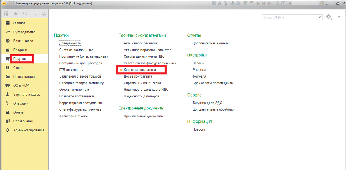 Корректировка долга в 1С:Бухгалтерии 8.
