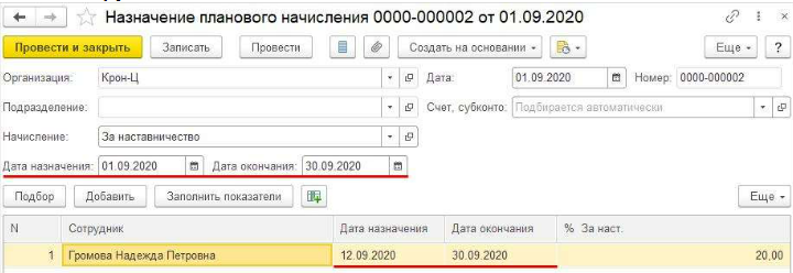 Определите параметры планового начисления, такие как периодичность, сумма, процент от базовой зарплаты и другие настройки, соответствующие вашим бизнес-процессам.
