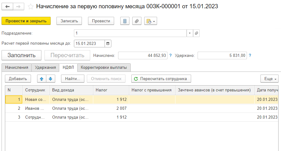 Удержание НДФЛ при выплате аванса по зарплате в программе 1С:Бухгалтерия предприятия