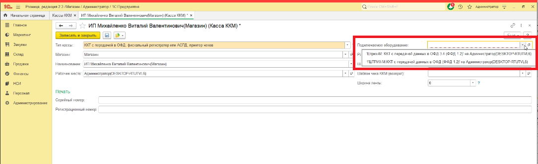 1С:Розница 2.2 Не смогли определить доступные кассы ККМ