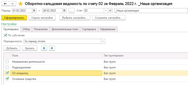 Оборотно-сальдовая ведомость по счету 01 в разрезе подразделений и МОЛ в 1С:Бухгалтерии 8.3