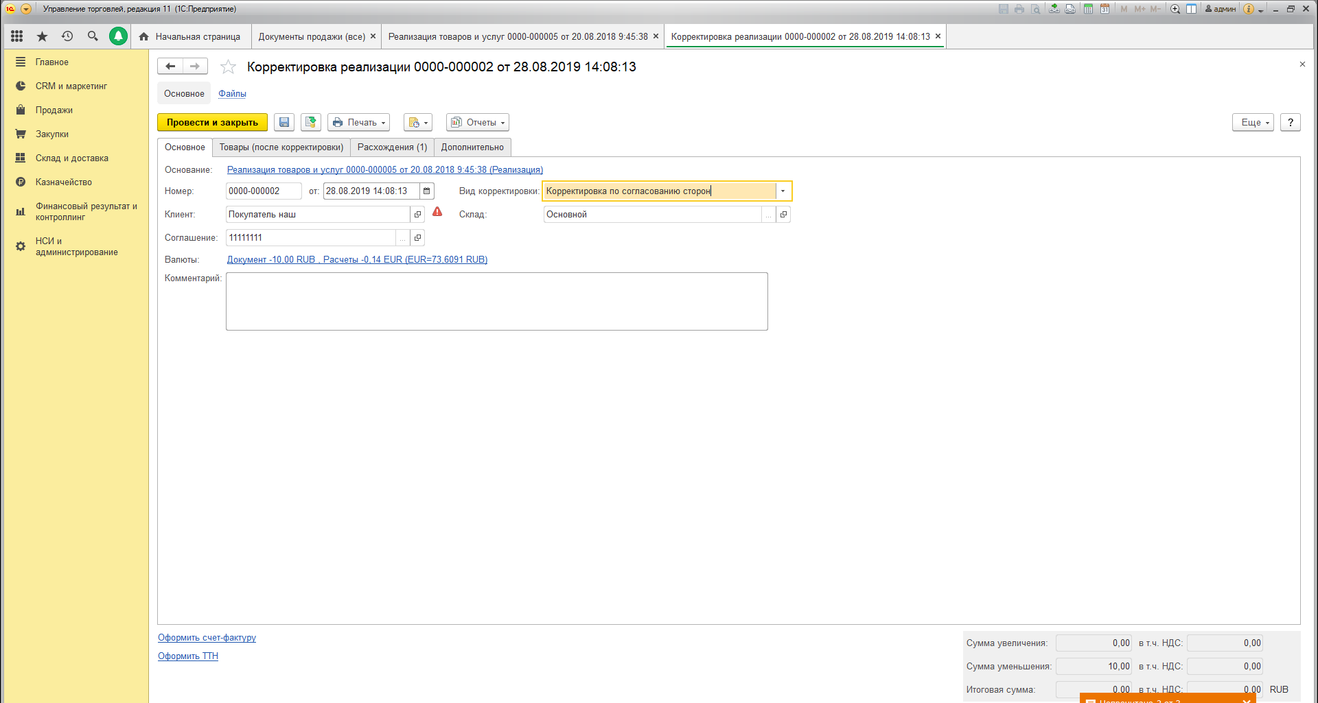 Как отражается корректировка реализации в 1С 8.3 в сторону уменьшения.