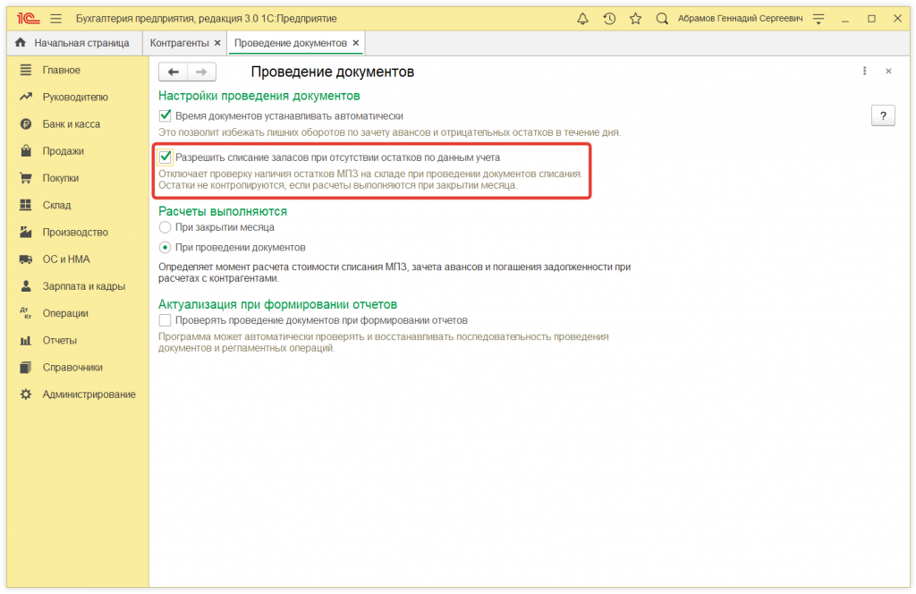 Отключаем контроль отрицательных остатков при списании товаров, материалов и прочих МПЗ