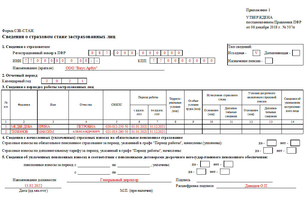 СЗВ-СТАЖ за 2021 год. Как заполнить и сдать. Примеры.