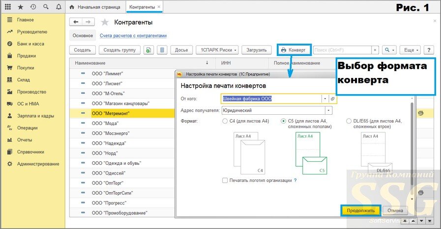 Помощник бухгалтера Печать на конвертах в 1С