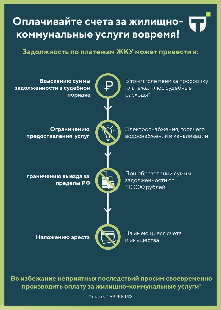 Помните, что задолженность по коммунальным платежам может привести к отключению услуг и появлению штрафов.