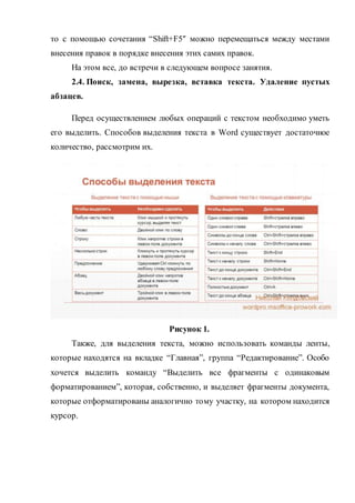 Поиск и замена, правописание, полезные сочетания клавиш, выделение текста, перемещение по тексту
