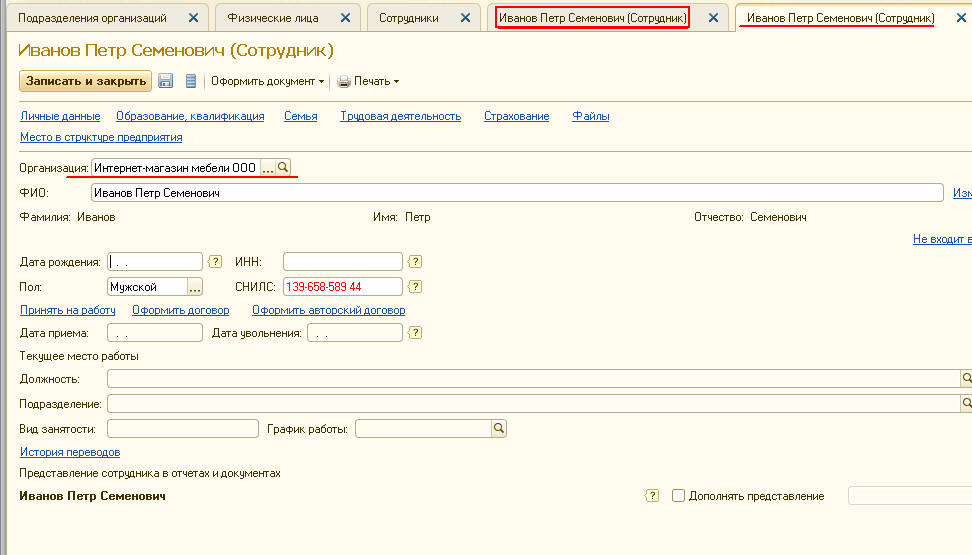 Прием на работу в 1С внутреннего совместителя