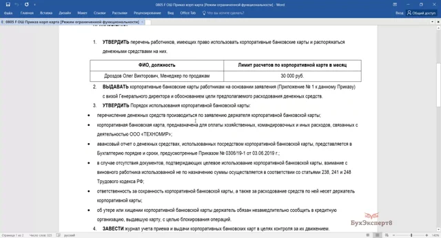 Работа с корпоративными картами в программе 1С Бухгалтерия