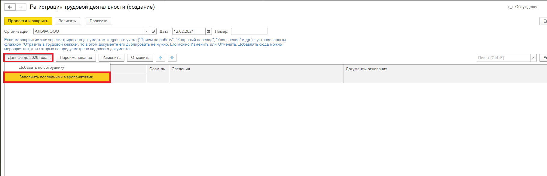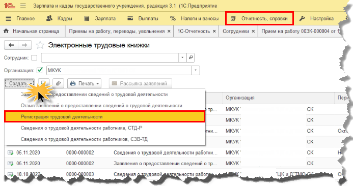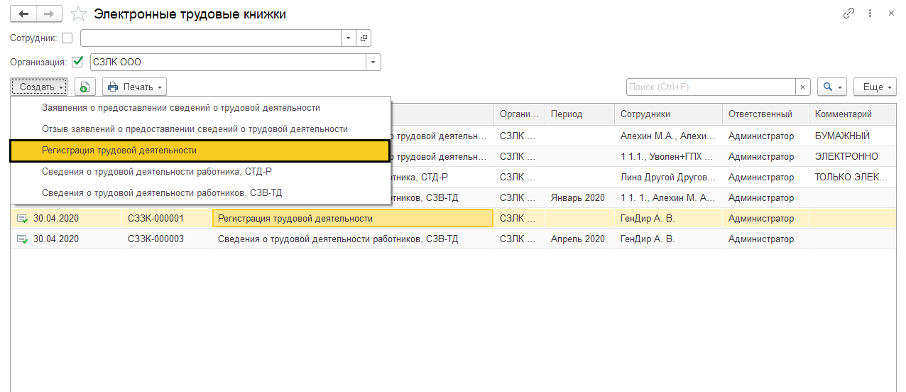 Регистрация трудовой деятельности в 1С ЗУП
