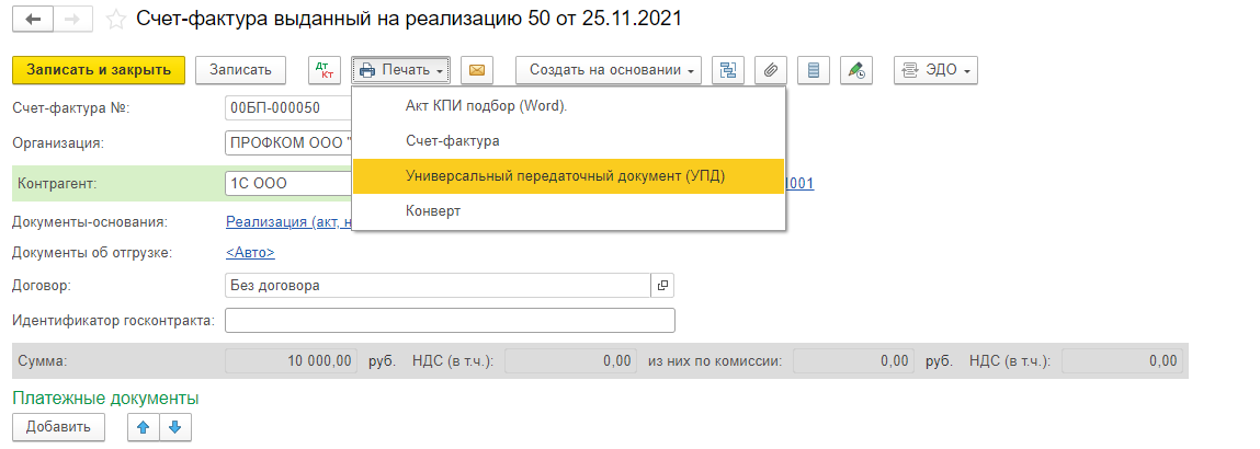 Универсальный передаточный документ в программе 1С: Бухгалтерия 3.0