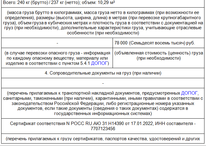 Не забудьте указать в транспортной накладной точную информацию о грузе, такую как его характеристики, упаковку и количество колли.