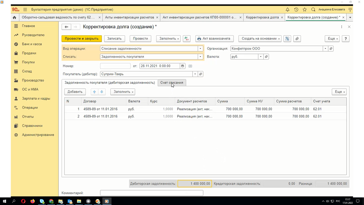 Проведение взаимозачета, перенос задолженности, списание задолженности + практика в 1С 8.3
