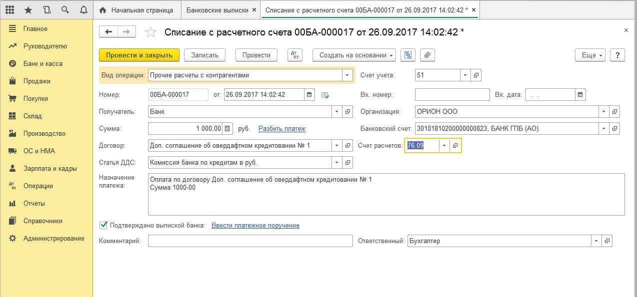 Списание с расчетного счета в 1С 8.3 Бухгалтерия