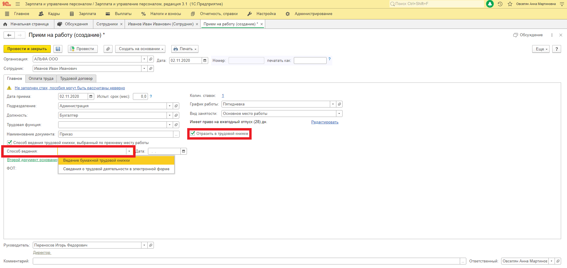 Как в 1С Бухгалтерия предприятия 3.0 указать способ ведения трудовой книжки в приеме на работу