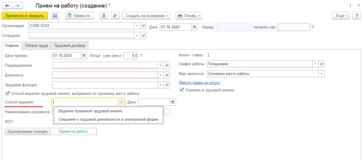 Указание способа ведения трудовой книжки в приеме на работу (1C:ЗУП)