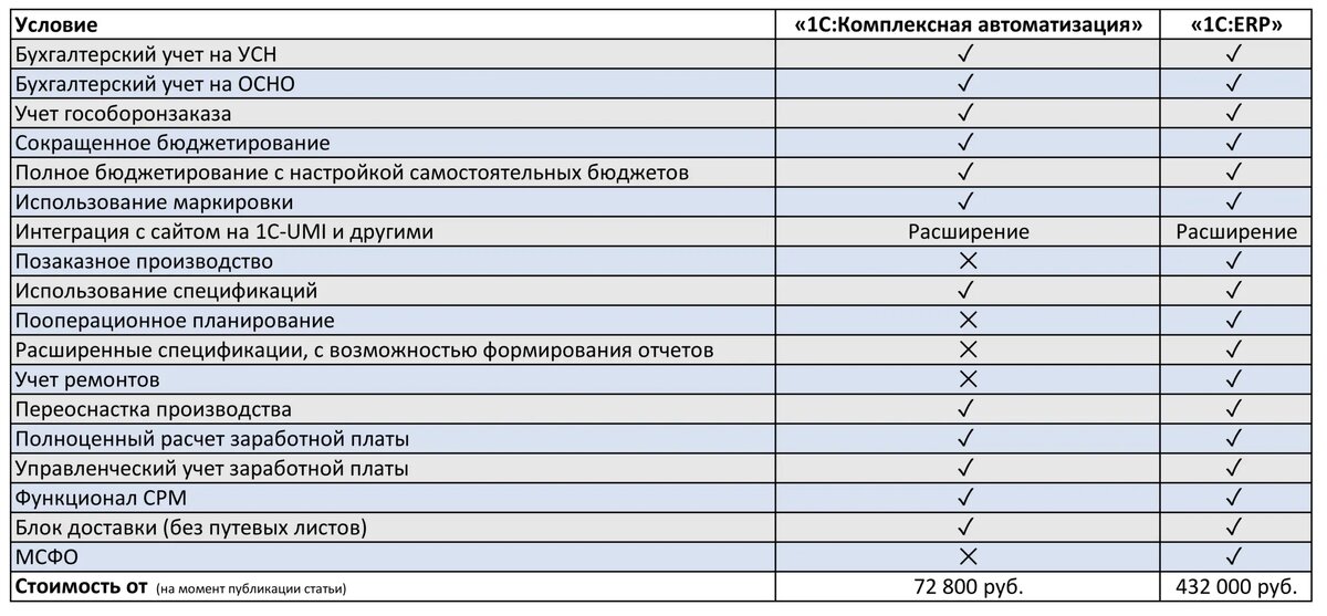 1С ERP vs 1С Комплексная автоматизация 2 сравнение