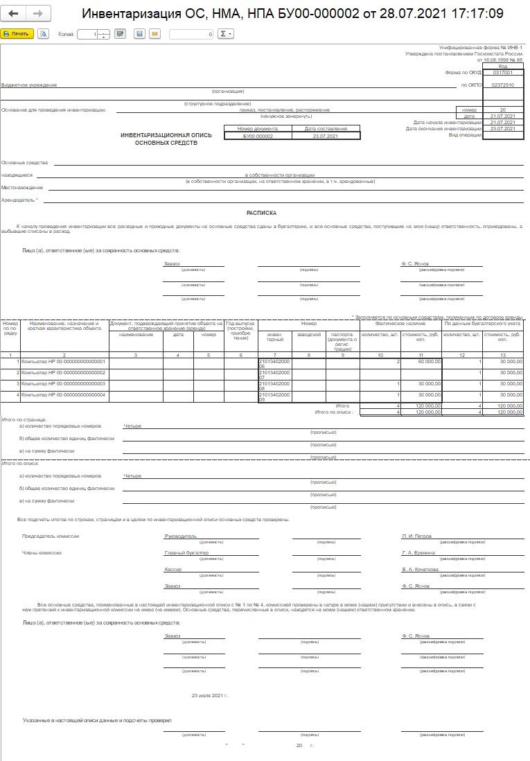 Отражение результатов инвентаризации и списание ОС в 1С 8.3