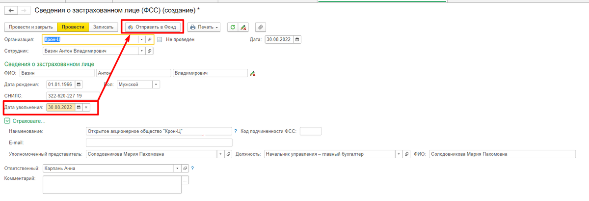 Отправка сведений о застрахованном лице в ФСС через уполномоченную бухгалтерию сбис