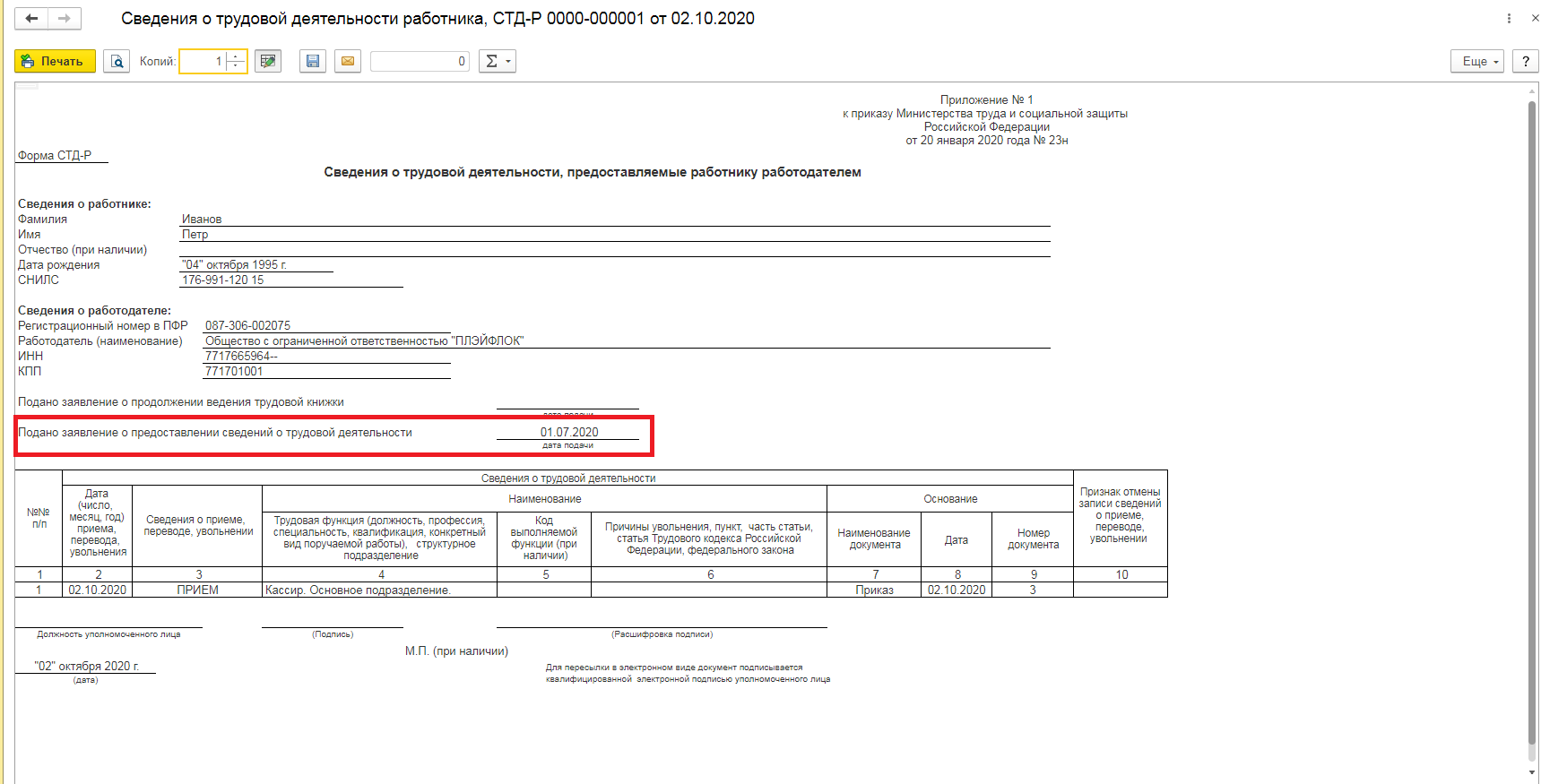 Подготовка сведений о трудовой деятельности по форме СТД-Р для сотрудника в 1С:ЗУП ред. 3